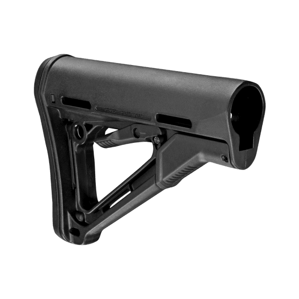 The Magpul CTR (Compact/Type Restricted) – Mil-Spec model is a drop-in replacement buttstock for AR15 / M16 carbines using Mil-Spec sized receiver extension tubes. Designed for light, fast action, the streamlined A-frame profile avoids snagging and shields the release latch to prevent accidental activation.