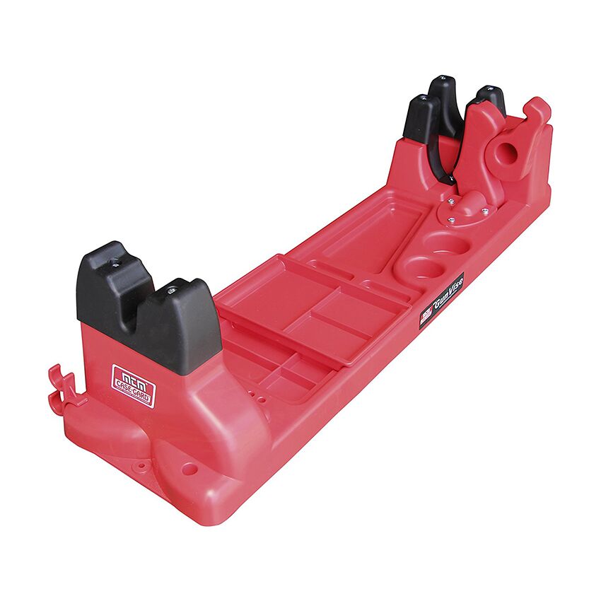 The MTM Gun Vise features a fast, single adjustment clamp down and a secure non-marring hold. The gun forks are positioned high and low giving the option of a level clamp up for maintenance, or a sloped clamp up for drainage.